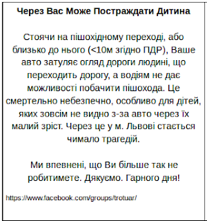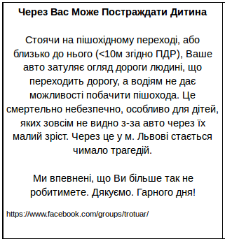 По-друге, листівка пояснює людині чому саме її поведінка погана. Люди дуже часто схильні ігнорувати той прикрий факт, що у всіх нас різний “контекст”, і тому те, що очевидно для Вас, може бути зовсім не очевидним для іншого. Я на власному досвіді переконався, що люди часто дійсно і щиро не розуміють чому паркувати машину на пішохідному переході чи на весь тротуар – жахливий вчинок. Для мене це очевидно, але… Людина може не ходити пішки, в неї може не бутишкільного віку дітей, які мають самі переходити вулицю. Можливо, людина виросла в селі, де багато місця, і паркуватись можна де заманеться. Одним словом, Ваш опонент знаходиться в іншій реальності, і тому в поясненні має бути не просто пунктПДР, чи ще чогось, а прості і зрозумілі аргументи Чому так робити не можна.