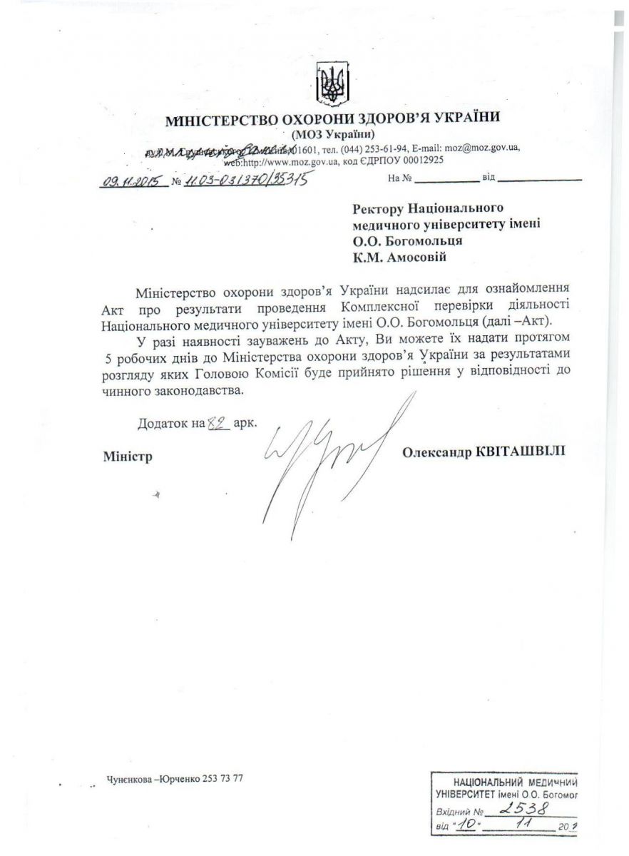 Член Правління ВМГО «Студентське братство» Уляна Ковальчук у своїй заяві про злочин повідомила про те, що раніше позиція міністра О.Квіташвілі теж змінювалася під впливом тих, кого МОЗ викривав у корупції. Так, 8 жовтня, після візиту до нього відстороненої Катерини Амосової, міністр Квіташвілі змінив на прохання причетної до корупції ректорки склад комісії з перевірки університету, замінив в.о.ректора на особу Ярослава Цехмістера (про корупційні правопорушення якого йдеться в Акті перевірки) і зрештою повернув Амосову на посаду ще до офіційного оприлюднення результатів перевірки.