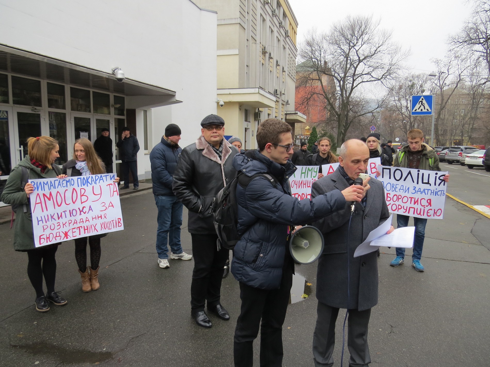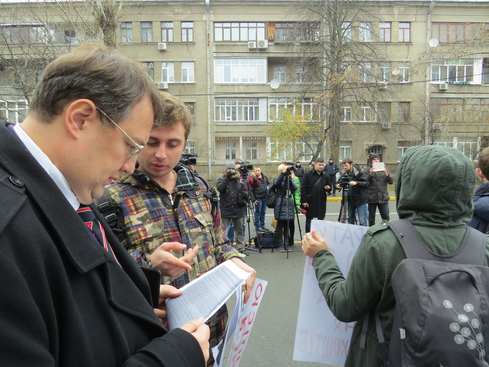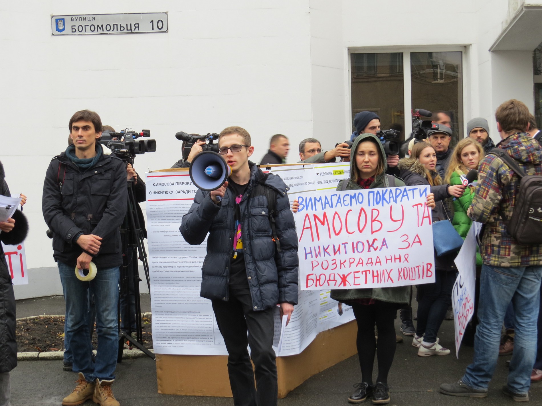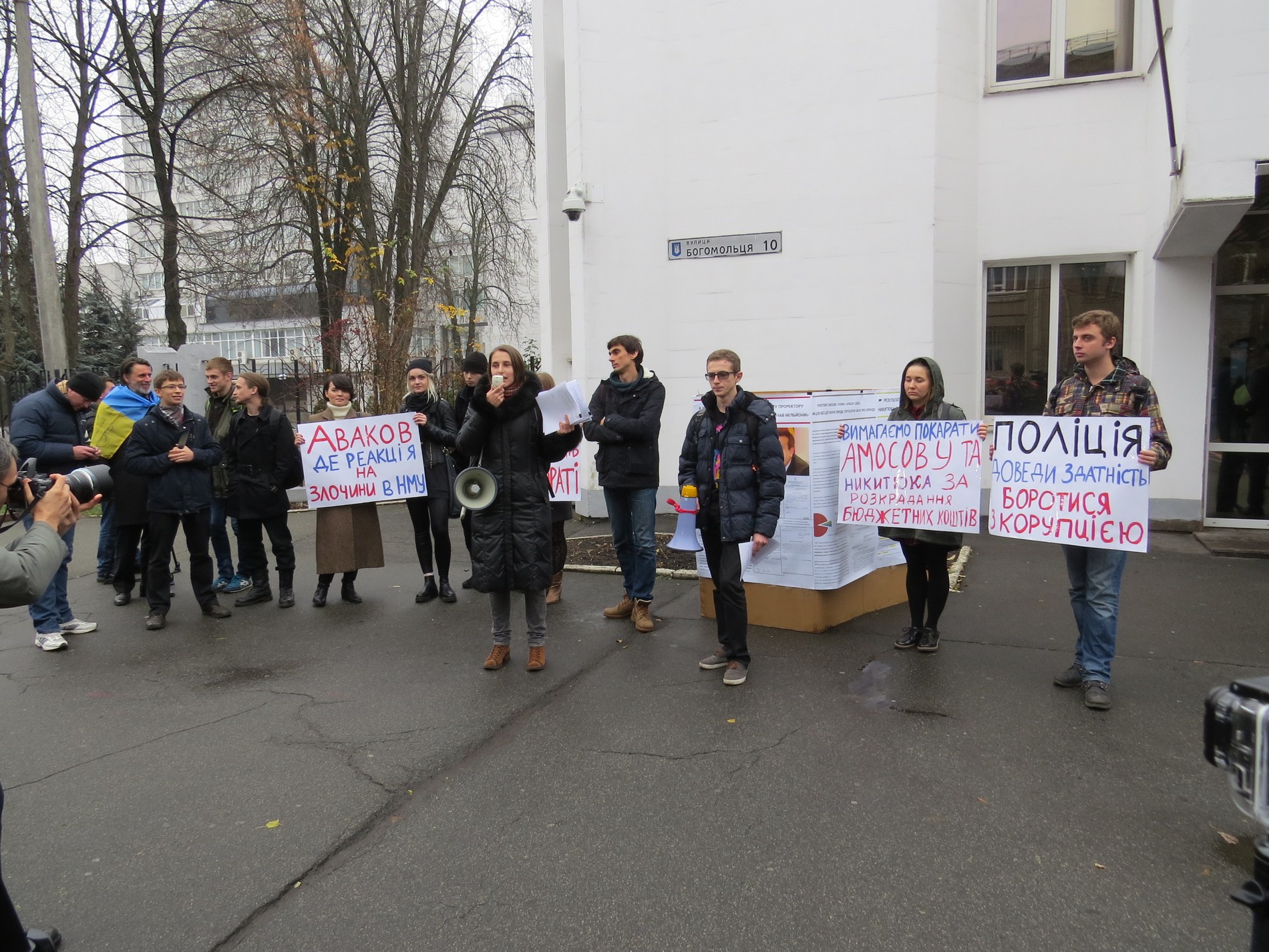 Активісти ВМГО “Студентське братство”, що вже понад рік за підтримки Міжнародного фонду “Відродження” здійснює антикорупційну кампанію, закликали міністра Арсена Авакова активізувати і взяти на особистий контроль розслідування кримінального провадження № 42015100000001179 щодо вчинення службовими особами НМУ ім.Богомольця кримінального правопорушення, передбаченого ч.5 ст.191 Кримінального кодексу України. Активісти роздали усім присутнім на пікеті журналістам та представникам МВС копію листа Голова СБУ Василя Грицака до народного депутата Тетяни Чорновол від 9.11.2015 року, де заявлено, що провадження ініційовано слідчим управлінням ГУ МВС в м.Києві 20.10.15 за матеріалами органів Служби Безпеки України.