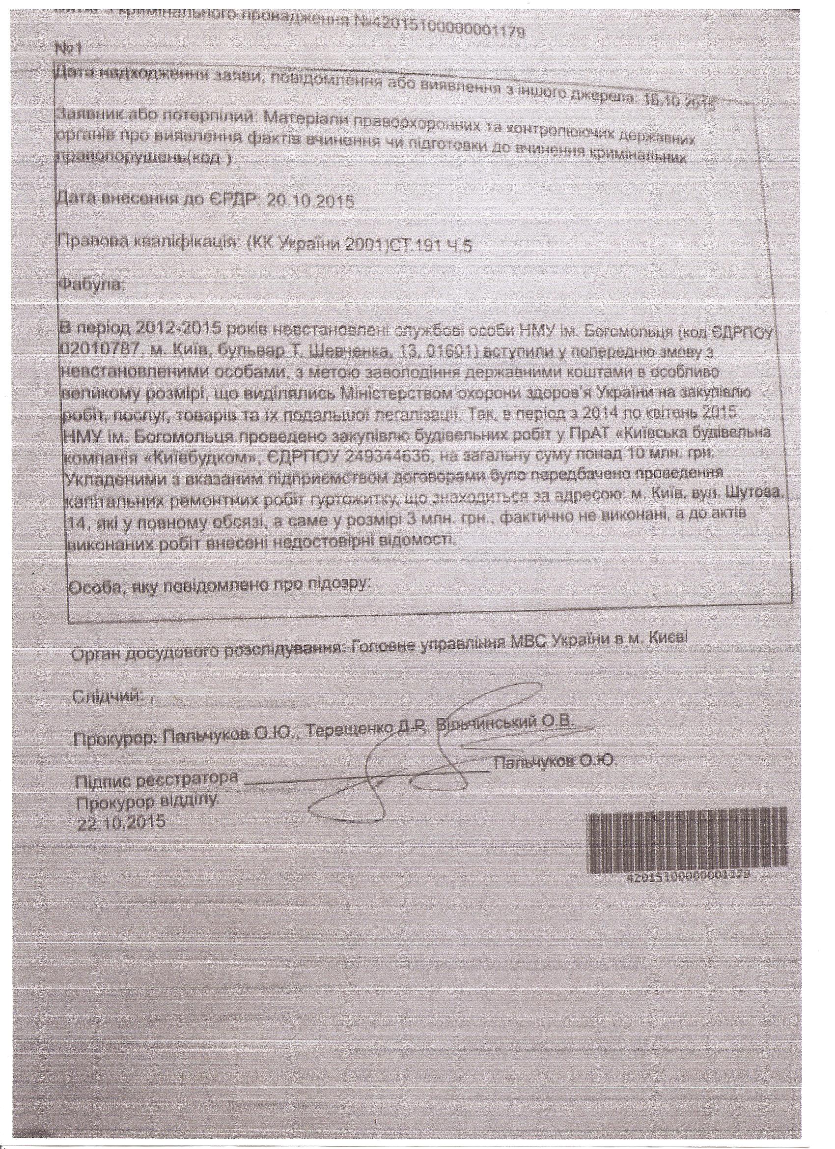 Під час акції Роман Романюк (координатор наметової акції ВМГО «Студентське братство», яка вже два тижні проводиться під стінами МОЗ з вимогою припинити корупцію в НМУ, студент 4-курсу стличного медуніверситету) в мегафон заявив, що кваліфікація статті, за якою відкрито кримінальне провадження щодо посадовців НМУ імені Богомольця передбачає покарання до дванадцяти років. Студент уточнив, що кваліфікований за статтею 191 ККУ злочин полягає в привласненні, розтраті майна або заволодіння ним шляхом зловживання службовим становищем. Роман Романюк наголосив, що п’ятий пункт цієї статті ККУ свідчить, що розкрадання відбулося в особливо великих розмірах та організованою групою (членами ректорату). Студент НМУ оприлюднив документ щодо відкриття провадження № 42015100000001179 за підписом прокурора-реєстратора кримінальних проваджень, у якому йдеться про привласнення 3 млн. бюджетних коштів, виділених МОЗом на держзакупівлі в результаті змови службових осіб НМУ ім.Богомольця.