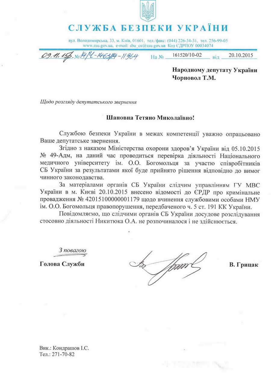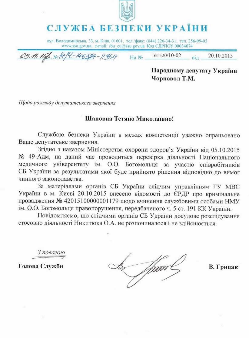 Під час акції керівник проекту «Ні!» корупції в медичних вишах» Уляна Ковальчук обурилася, що досі її не опитали слідчі, хоча від імені ВМГО «Студентське братство» вона подала на ім’я Міністра Арсена Авакова ще 10 листопада заяву про злочини керівництва МОЗ, здійснені в інтересах корупціонерів з НМУ. Уляна Ковальчук вимагає від правоохоронців пояснити, яким чином гербовою печаткою Міністерства фальсифікатори документів з МОЗ так безкарно заднім числом завіряють договори про використання державного майна з приватною структурою, які ніколи не реєструвалися в Міністерстві, але які дуже потрібні для порятунку ректорки НМУ Катерини Амосової від кримінальної відповідальності щодо «зловживання службовим становищем посадовими особами Університету з метою особистого збагачення». Саме такий висновок міститься у підписаному представниками СБУ, МВС усіма іншими членами комісії, які ходили на об’єкт перевірки, Акті перевірки НМУ від 30 жовтня 2015 року. Цей Акт на 88 сторінок оприлюднено у Facebook Студентського братства. Водночас, сам міністр Олександр Квіташвілі, який будучи головою комісії ніколи не брав участі в її роботі, ніколи не виїздив на об’єкт перевірки, Акт не підписав, хоч і обіцяв це зробити голодуючим студентам. Натомість міністр, який як голова комісії з перевірки університету, фактично самоусунувся від перевірки НМУ, 9 листопада всупереч наказу МОЗ № 147 передав Акт у непідписаному (ним же як головою комісії) вигляді корупціонерам – ректору НМУ імені Богомольця. Це, на переконання Студентського братства, дозволяє здійснити подальше підроблення документів – створити і “докласти” документи, які зазанчені в Акті як відсутні.